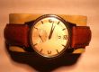 Uhr läuft und hat ein relativ neues passendes Lederarmband. Handaufzug nicht überdreht. Ganggenauigkeit wurde nicht überprüft.