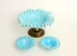 Tolles Set bestehend aus einer großen Glasschale mit rundem Messingfuß in lichtblauem Glas und opakweißem Überfang. Durchmesser: ca. 23 cm. Dazu passend zwei kleinere Glasschalen - ebenfalls mit "gerüschter Fahne". Alle drei Stücke von WMF, wahrscheinlich um 1900.