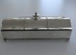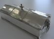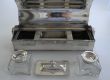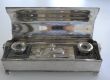 Dieses sehr filigrane Tintenset wurde in Frankreich um 1900 aus versilbertem Kupfer gefertigt. An den Rändern ist es mit einer feinen Perlenbordüre gearbeitet. Klappt man das Tintenzeug auf, sieht man zwei kleine Fässchen aus Glas und den Tupfer. Insgesamt sehr fein und edel hergestellt. Die Schmalseiten schmücken zwei fein verzierte Löwenköpfe, in deren Mäulern drehbare Ringe befestigt sind.